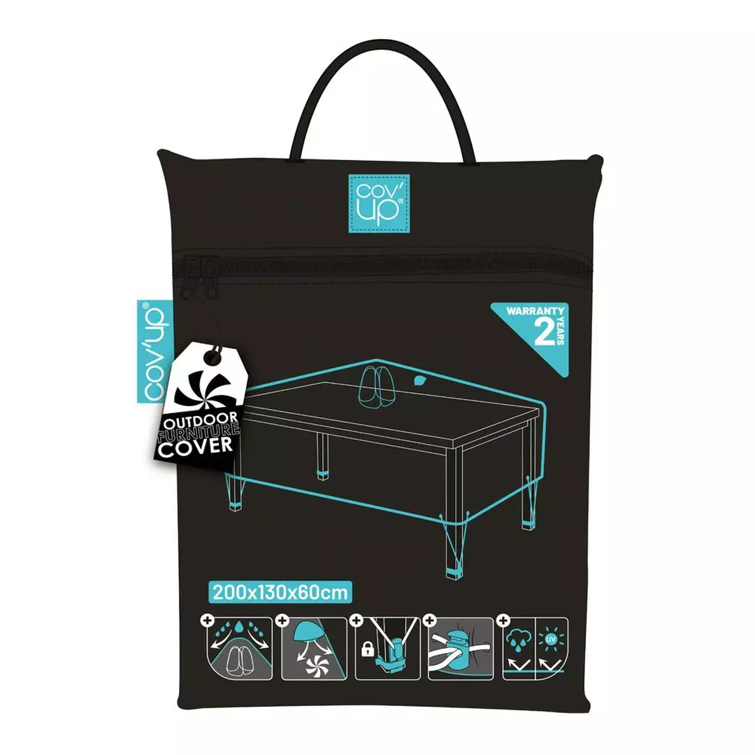 La housse de table de jardin rectangulaire possède 2 scratchs de fixation anti-vent pour qu’elle ne s’envole pas ainsi qu’1 cordon de serrage pour un ajustement parfait de la housse au mobilier et 1 valisette de rangement.