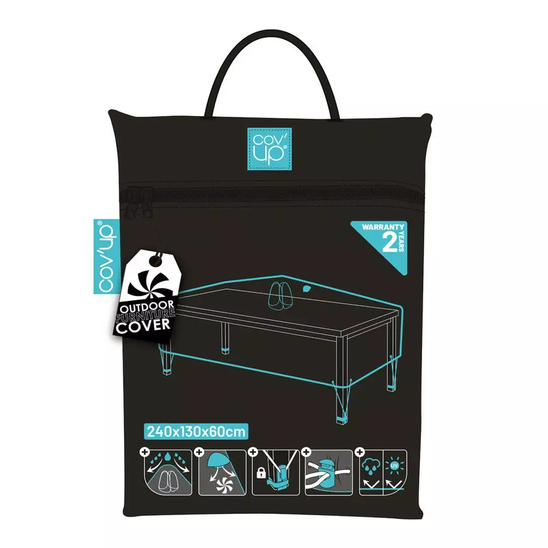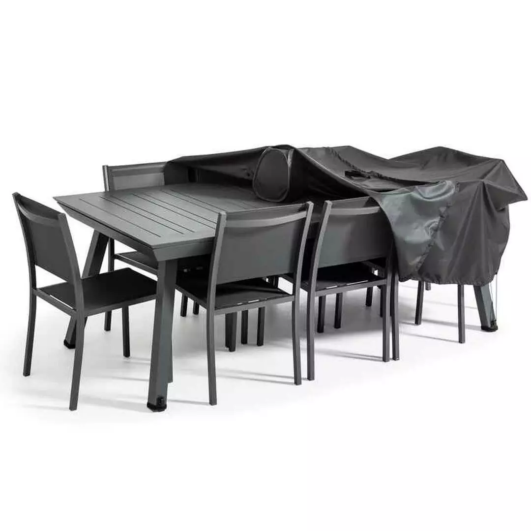 La housse de table de jardin rectangulaire possède 2 scratchs de fixation anti-vent pour qu’elle ne s’envole pas ainsi qu’1 cordon de serrage pour un ajustement parfait de la housse au mobilier et 1 valisette de rangement.