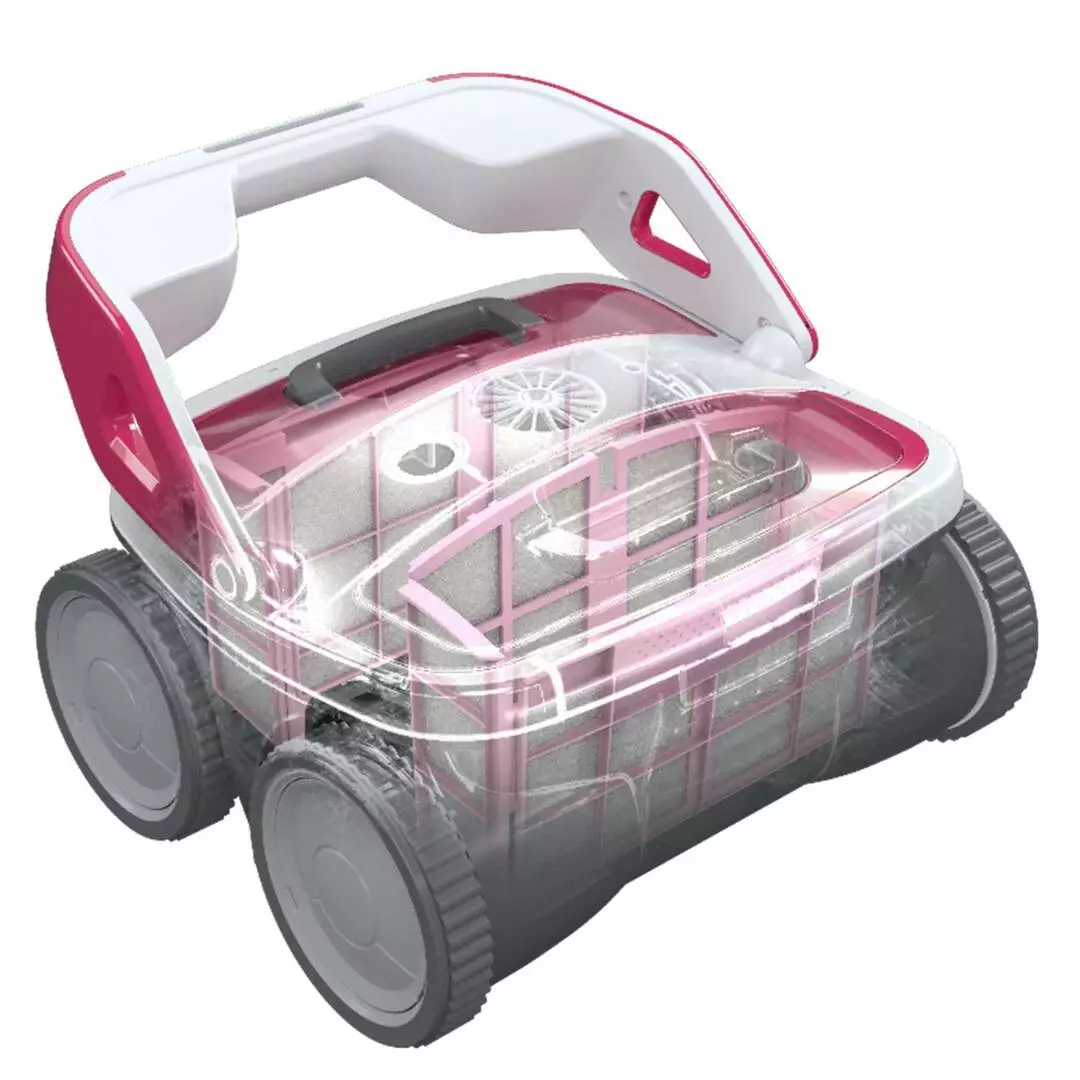 Grâce à ses 4 roues brosses de nettoyage, il déloge les saletés pour laisser la surface parfaitement propre. La brosse rotative supplémentaire assure un nettoyage impeccable du fond de la piscine.
